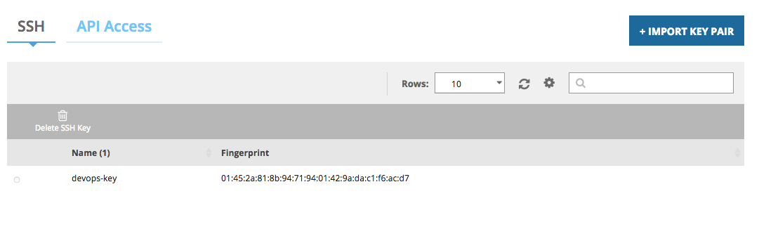 3\. Select the SSH key to delete from the list of available SSH key-value pairs in the SSH tab.