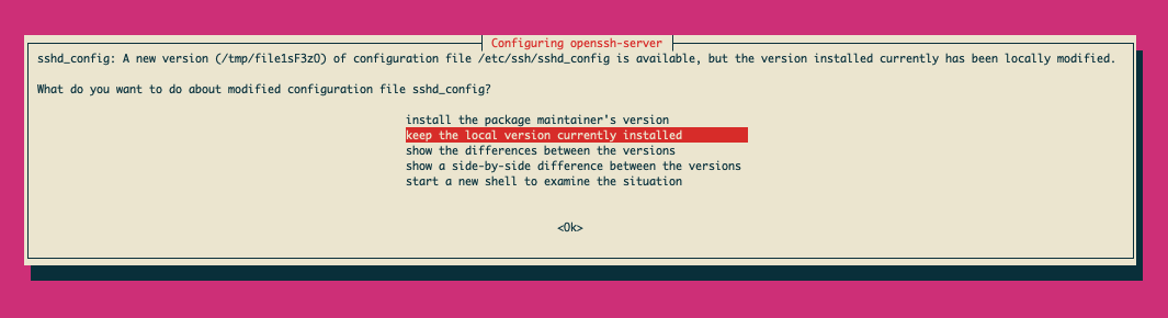 3. As the installation proceeds, you will be periodically prompted to choose if you want an updated config file for various services. Remember to pick `keep the local version currently installed.`