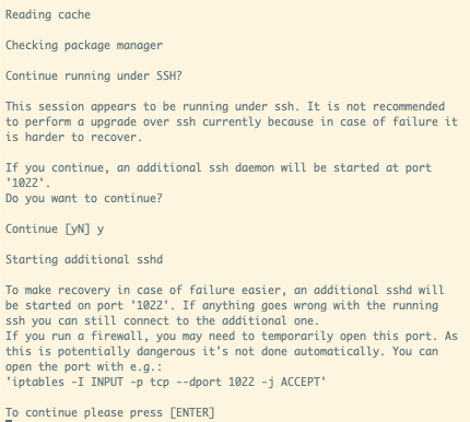 We use `do-release-upgrade` to upgrade to the next LTS release. For recoverability in case of failure, `do-release-upgrade` opens another SSH session on port `1022`. If you have a firewall blocking access to that port, you would need to open that up now.