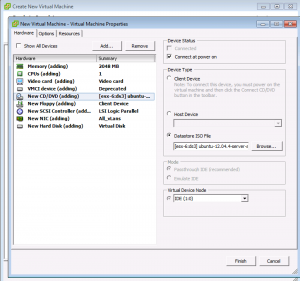Create a Virtual Machine and edit VM settings before completion. Edit the CD ROM to point to the uploaded iso from Step 2. Check the option for connecting it at power on.