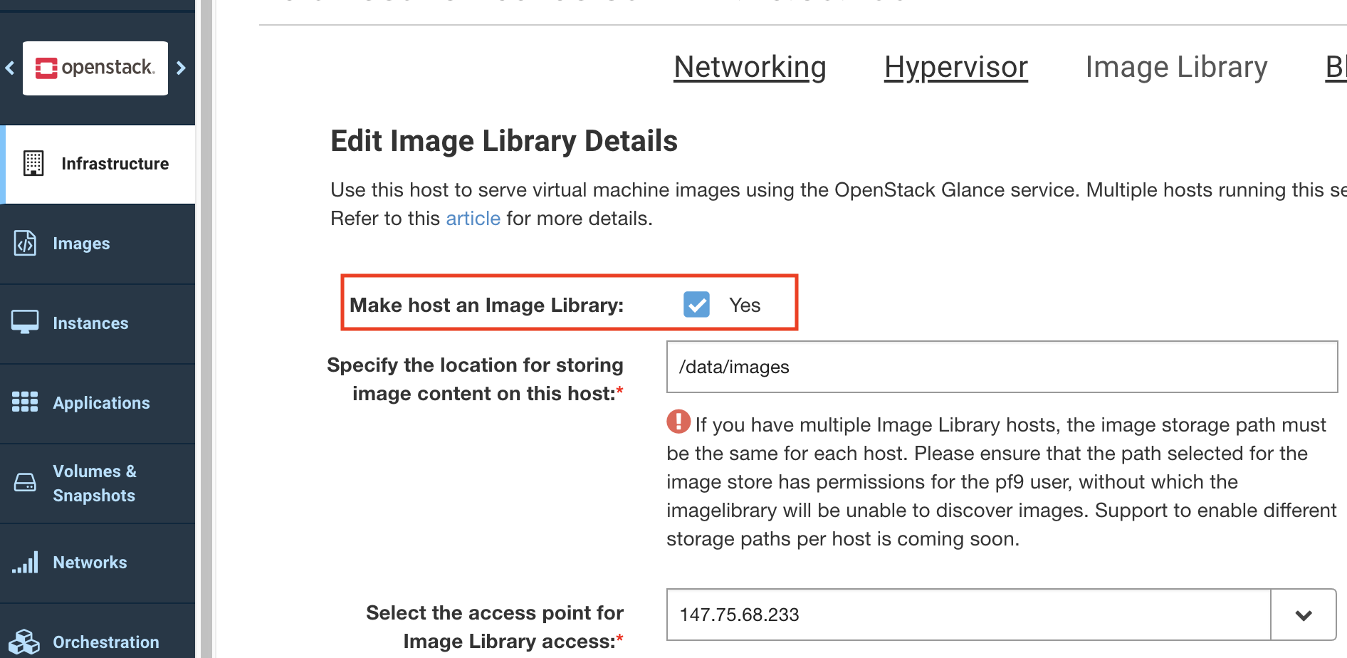 As part of this process, you need to specify the location (the directory path) to store image content on the host. The default path is `/var/opt/pf9/imagelibrary/data`.