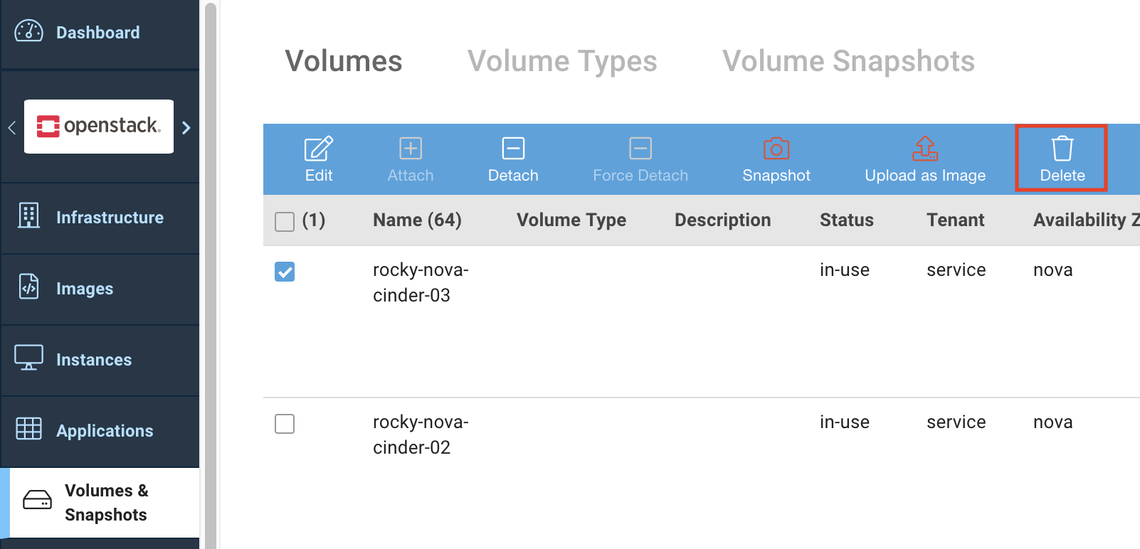 4\. Select the detached volume and click the Delete option seen above the list of volumes.