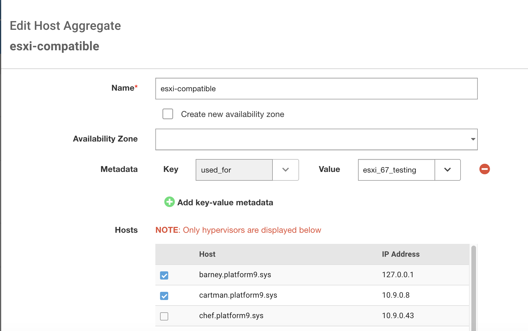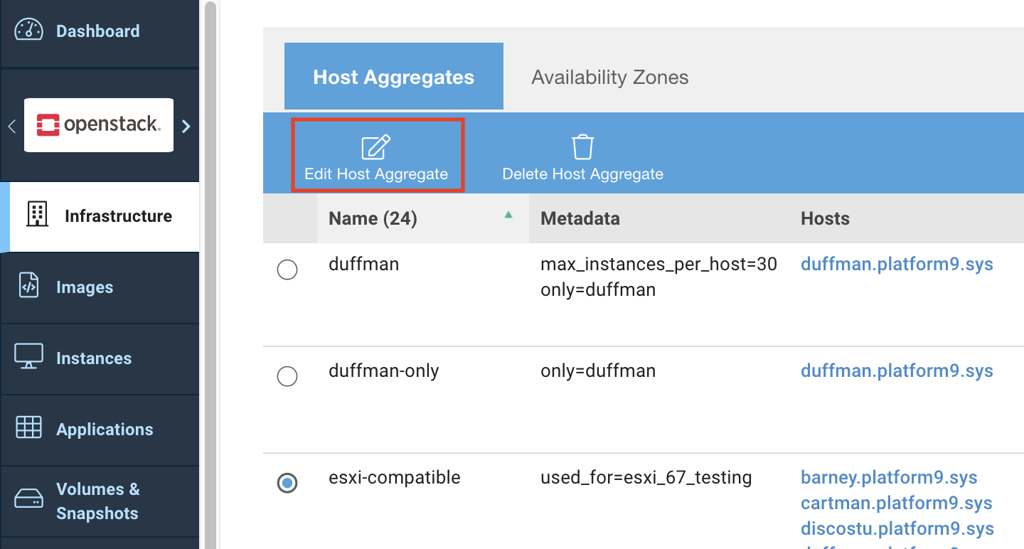 2\. Select the host aggregate and click Edit Host Aggregate option seen above the list of host aggregates.