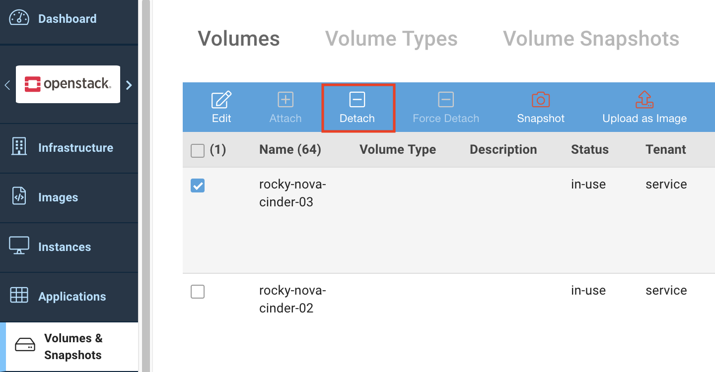 3\. Click Detach seen above the list of volumes. Confirm the detach operation.