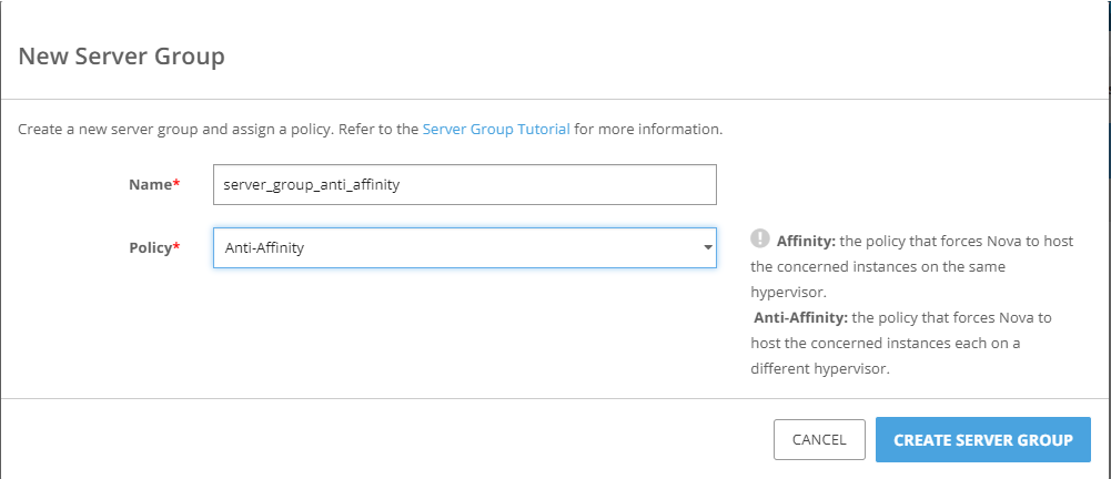 You can assign a server group with an anti-affinity policy to virtual machine instances that run applications or services such as SQL server, and cannot afford to have a downtime. When the replicas of the such applications or services are placed on distinct hosts, the anti-affinity policy offers resiliency and the services suffer a negligible downtime.