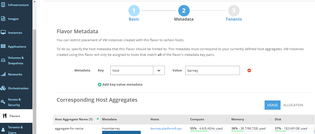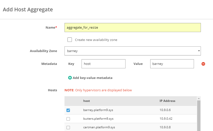 1\. Create a host aggregate containing only the hypervisor host that you want to use to resize the instance. Add aggregate metadata to it.