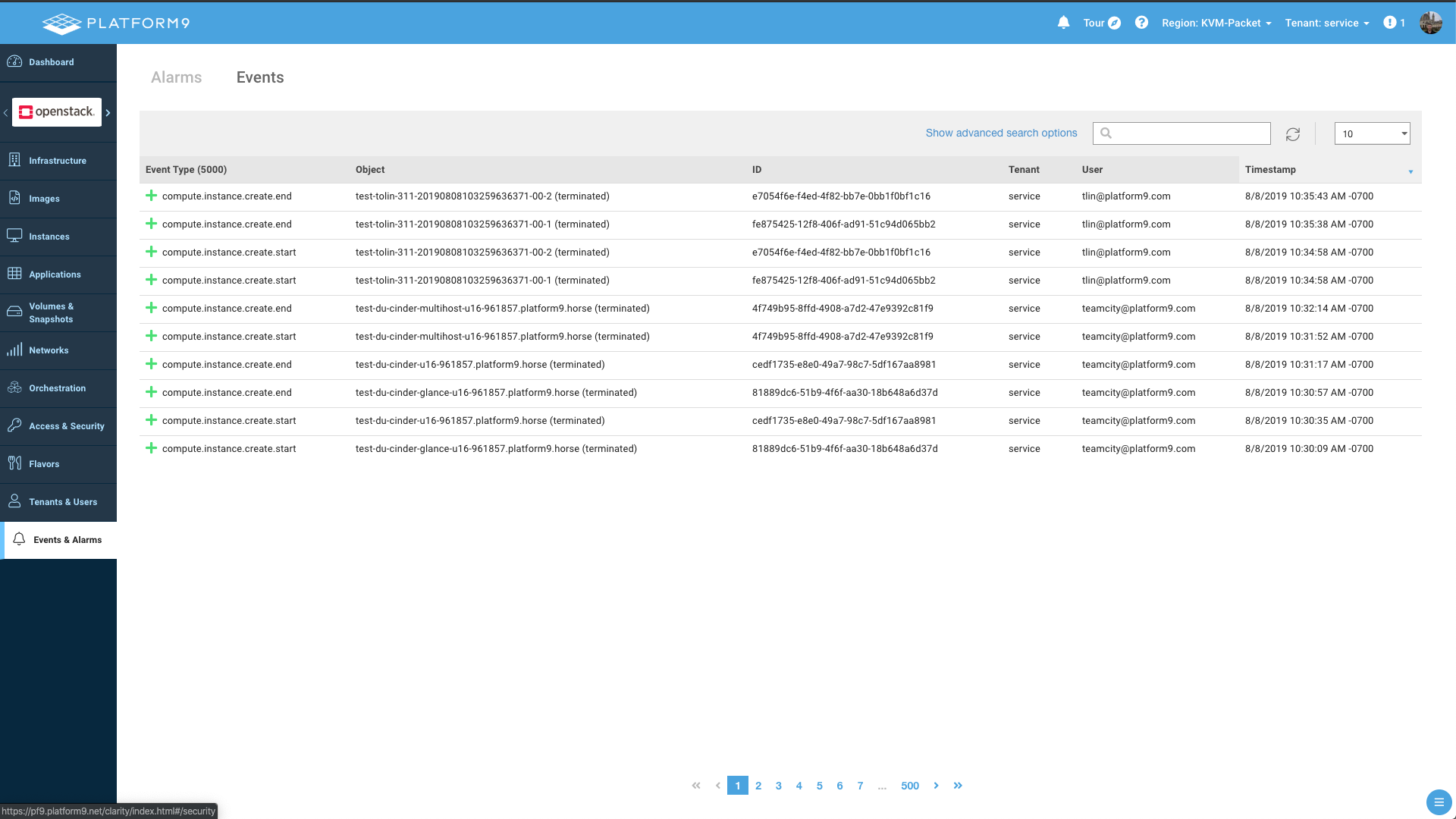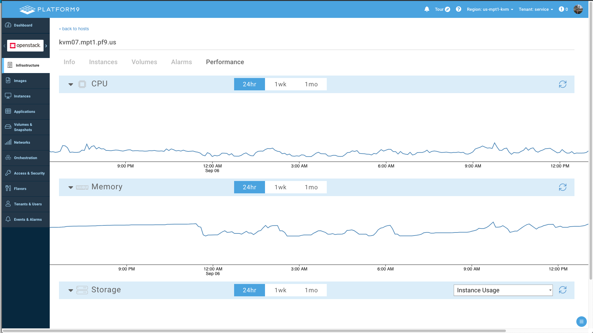 Platform9 deploys and operates Ceilometer, aodh and gnocchi to collect, analyze data, display metrics, generate events, and send alarms. This data is exposed in Clarity in four primary locations: