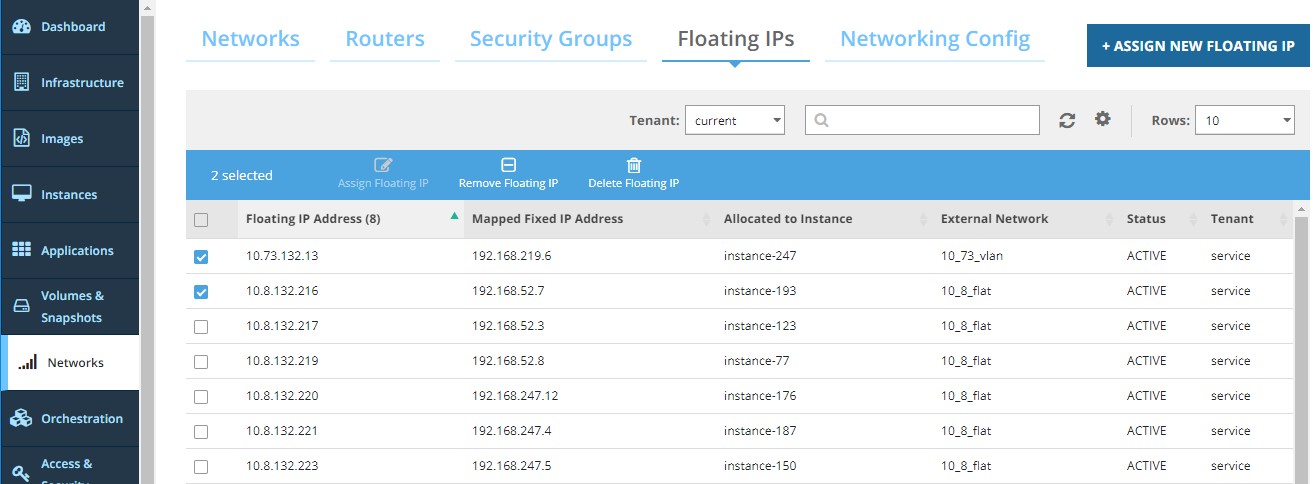 4\. Select the check boxes for the floating IP addresses that you want to dissociate.