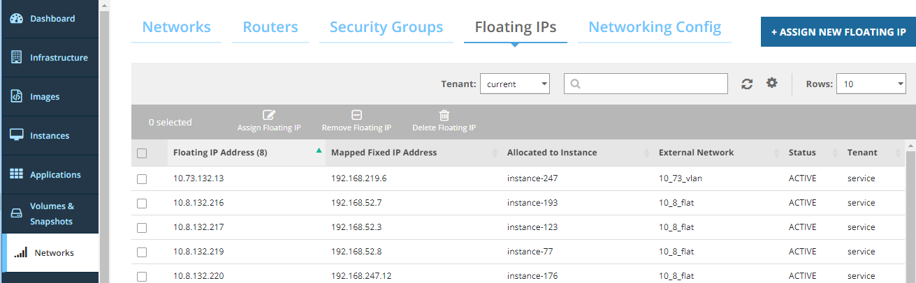 Alternatively, you can create a floating IP address and assign it to an instance after creation. The external network, over which you to make the instance accessible, must be configured before you create the new floating IP address. The instance to which you want to assign the floating IP address must be created before you can assign the floating IP address to the instance.