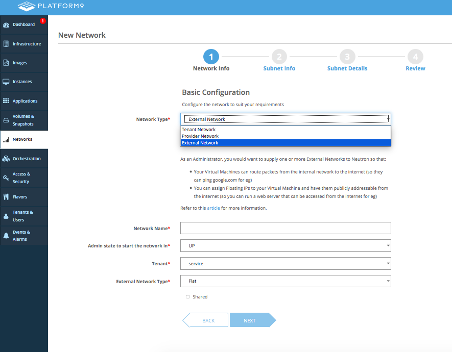 To create a tenant network in Platform9, browse to the ‘Network’ menu, then select ‘Create New Network’ and then select ‘Tenant Network’ from the network type drop-down menu.