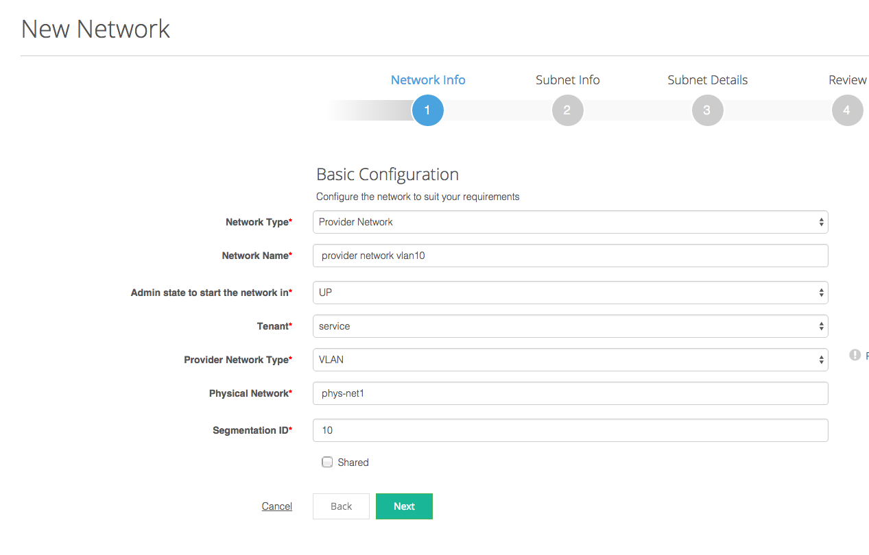 **Note:** Unlike provider networks, tenant networks do not offer you the option of specifying what VLAN ID this network should utilize. This is because tenant networks are meant to be consumed primarily by self-service users for use cases such as deploying a private network for your multi-VM Heat application stack, etc. When you deploy a tenant network, a VLAN ID will be automatically selected for it from the pool of VLAN IDs the underlying physical network config is configured with.