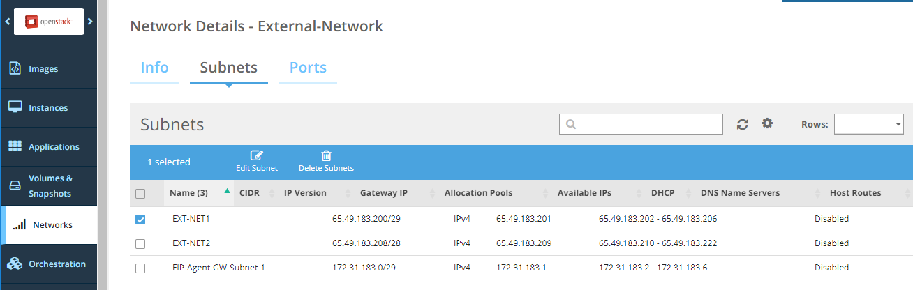 You can edit subnet details such as name, allocation pools, DNS name servers, gateway IP, host, and subnet routes. You can modify the enabling or disabling of DHCP and gateway.
