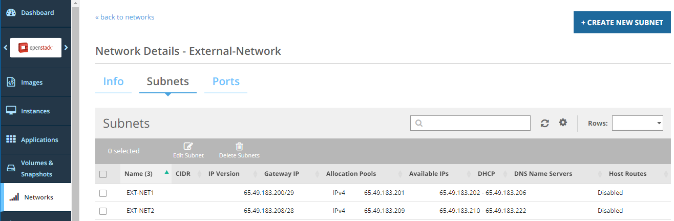 4\. Click the Subnets tab to view a list of existing subnets for the selected network.