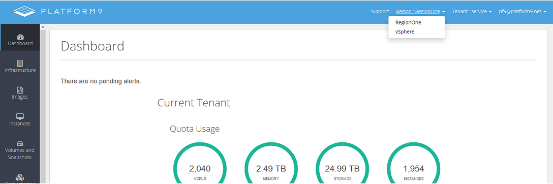 In version 1.5, users will notice a new menu at the top of the Platform9 user interface that allows them to select from a list of regions. Choosing a particular region gives them control over the resources managed by that region's services.