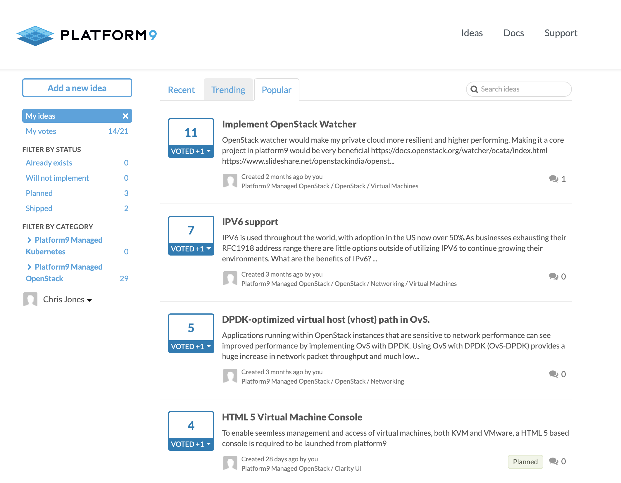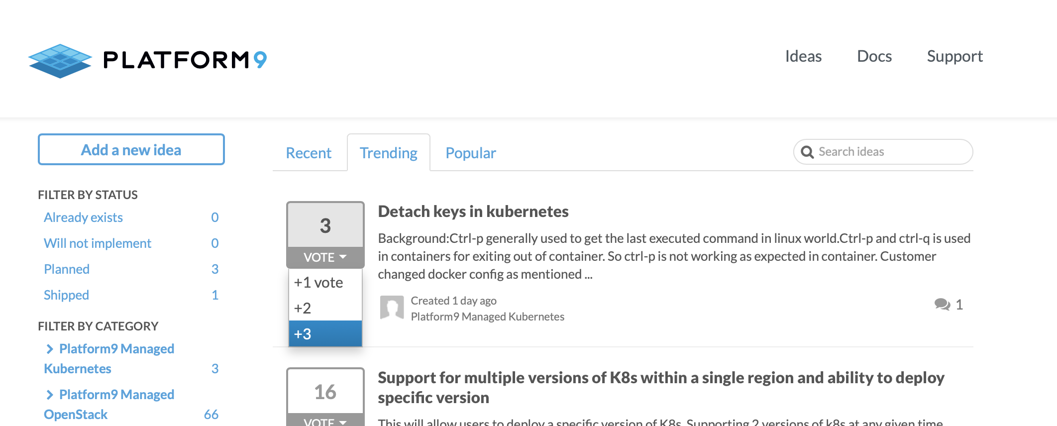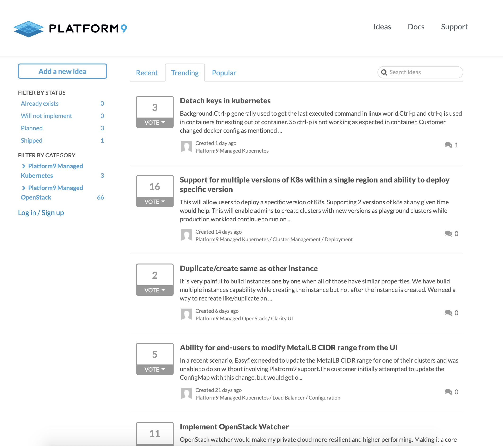 The Platform9 Ideas portal, accessible [here](https://ideas.platform9.com/) is your direct path to helping define future releases. The ideas portal enables you to create, vote and comment on, not just your own ideas, but ideas from everyone; including the whole team at Platform9. Once you have created an idea the Platform9 product management will review its viability and potentially plan it for a future release. Every step along the lifespan of an idea the ideas portal will notify you of comments, state changes and when implemented, that your idea has been shipped in a release!
