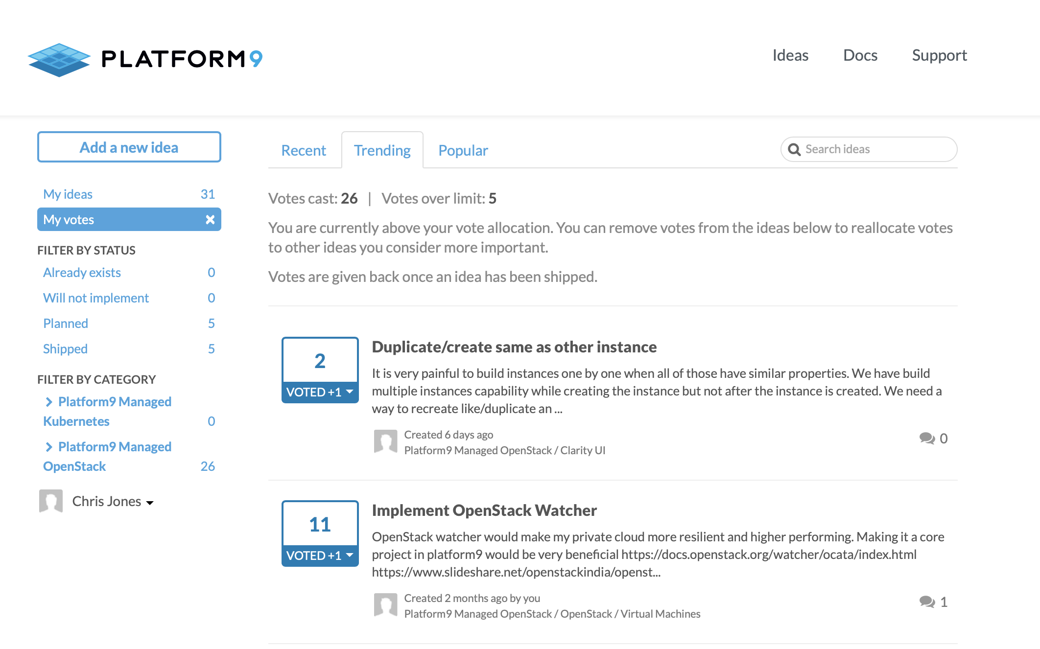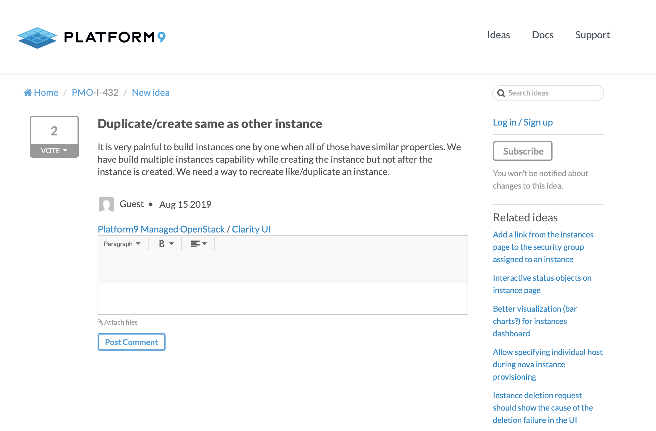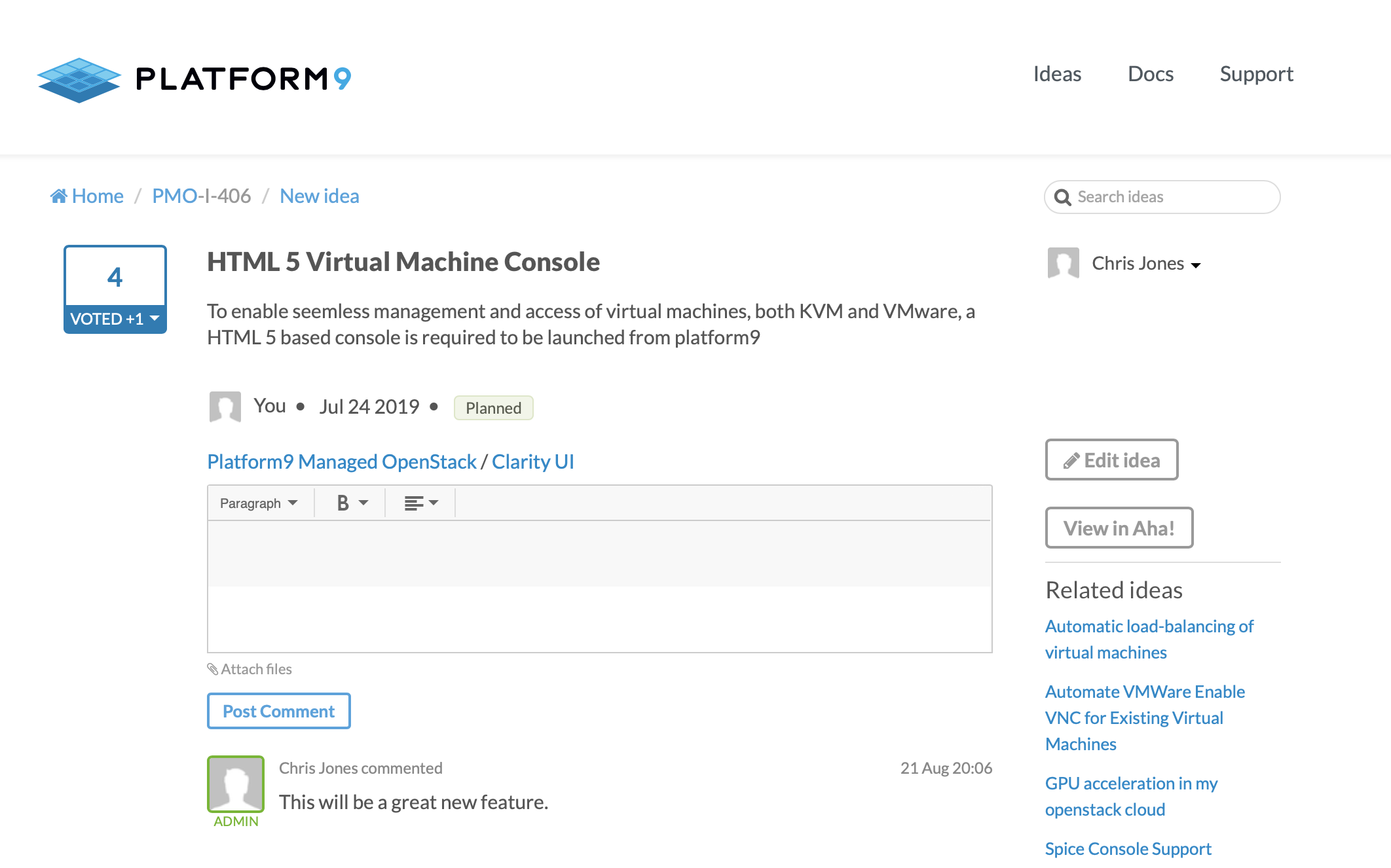 The Platform9 Ideas portal, accessible [here](https://ideas.platform9.com/) is your direct path to helping define future releases. The ideas portal enables you to create, vote and comment on, not just your own ideas, but ideas from everyone; including the whole team at Platform9. Once you have created an idea the Platform9 product management will review its viability and potentially plan it for a future release. Every step along the lifespan of an idea the ideas portal will notify you of comments, state changes and when implemented, that your idea has been shipped in a release!