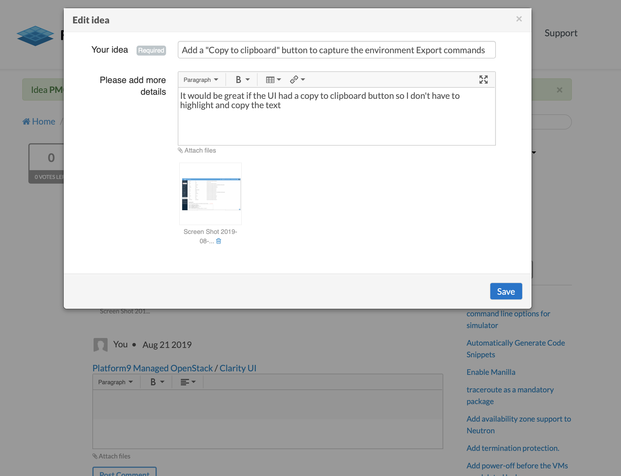 It is also possible to have ideas created whilst working with Platform9 Support directly from our support platform Zendesk.