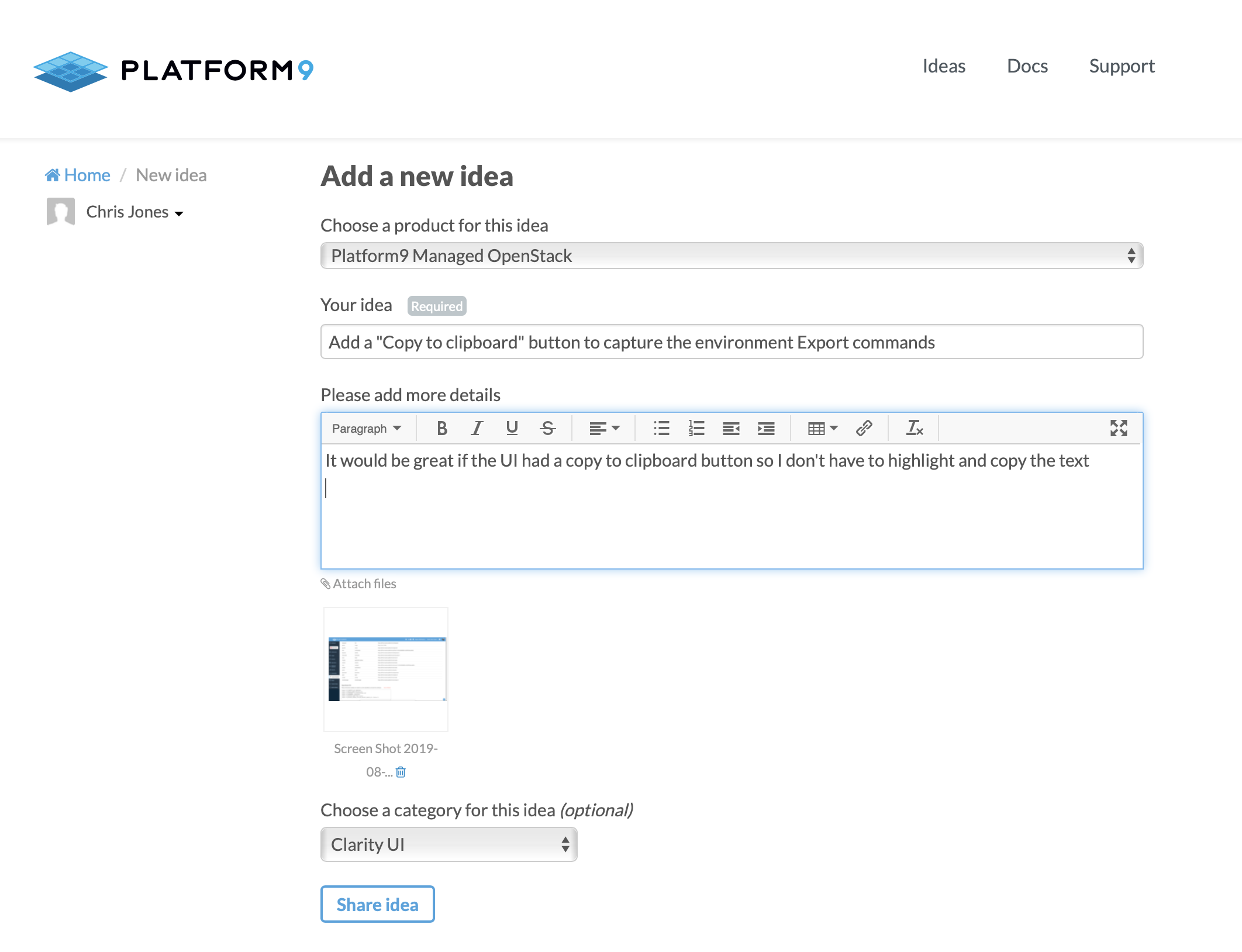 **Answer:** Submitting an idea is easy, head to the [Ideas Portal](https://ideas.platform9.com/ideas/new) and click the “Add a new idea” button in the top lefthand side of the ideas portal home page. Once on the New Idea page, select your product, enter a description, attach an image or two, leave some details around what you would like to see, select a category and click “Share idea”.