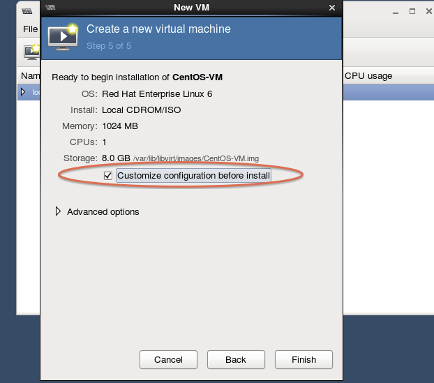 Select appropriate values for CPU and Memory. (These can be changed later during creating a new VM from this Image). Select at least 8 GB in disk size. Keep all the other parameters to their default values. For the last page of the dialog, make sure to select the option “Customize configuration before install”