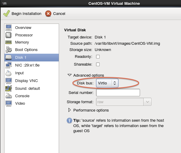 This will open the Virtual Machine customization wizard before launching operating system installation. Select the Disk in the left menu, then expand “Advance options” and select “Virtio” for the Disk bus.