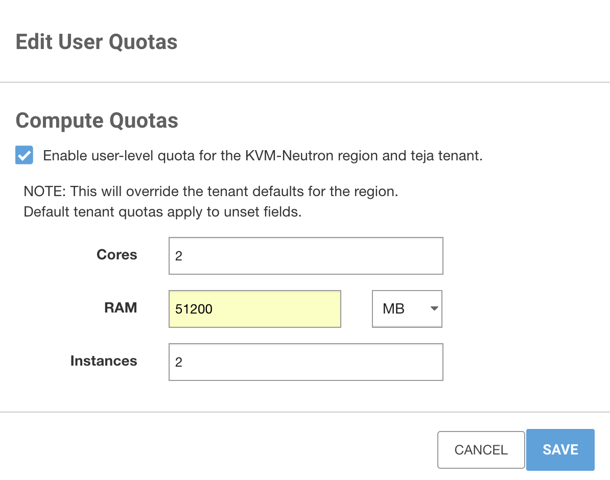 The specified quotas are applicable to the user when the user logs in to and uses Platform9 Managed OpenStack.