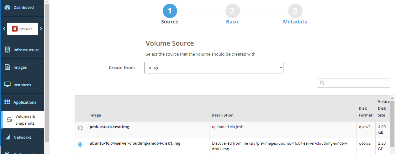 A volume is created successfully from the image. The volume can be attached to an instance. You can take a snapshot of the volume or upload the volume as an image.