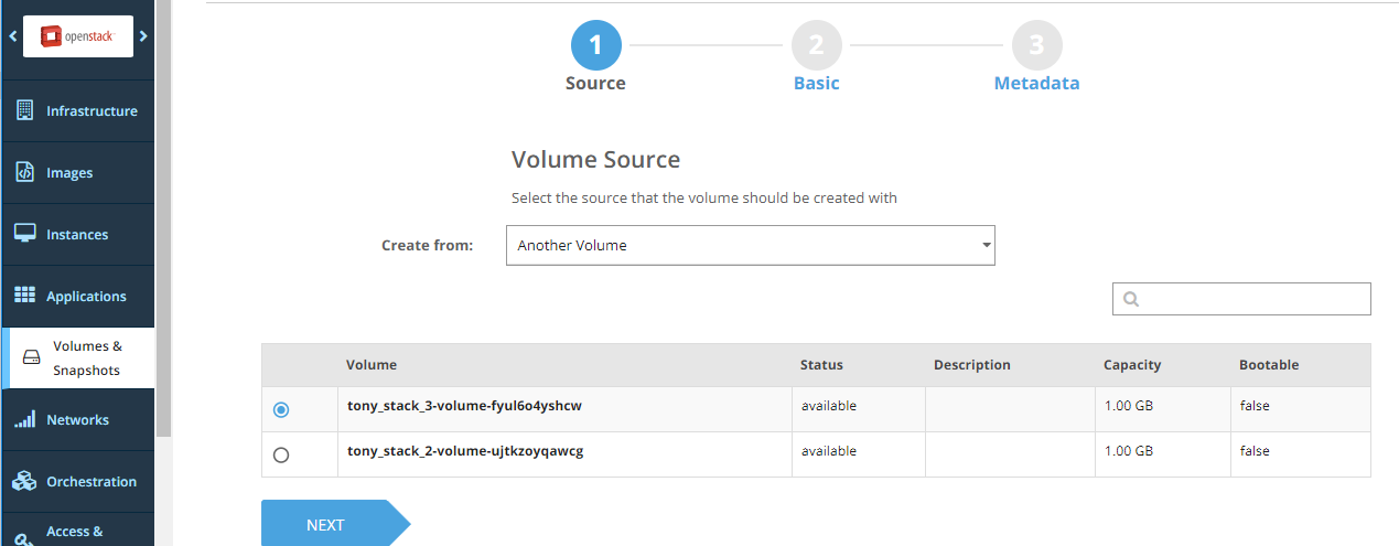 A volume is created successfully from another volume. The volume can be attached to an instance. You can take a snapshot of the volume or upload the volume to Glance as an image.