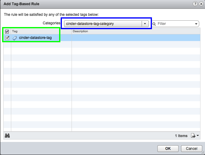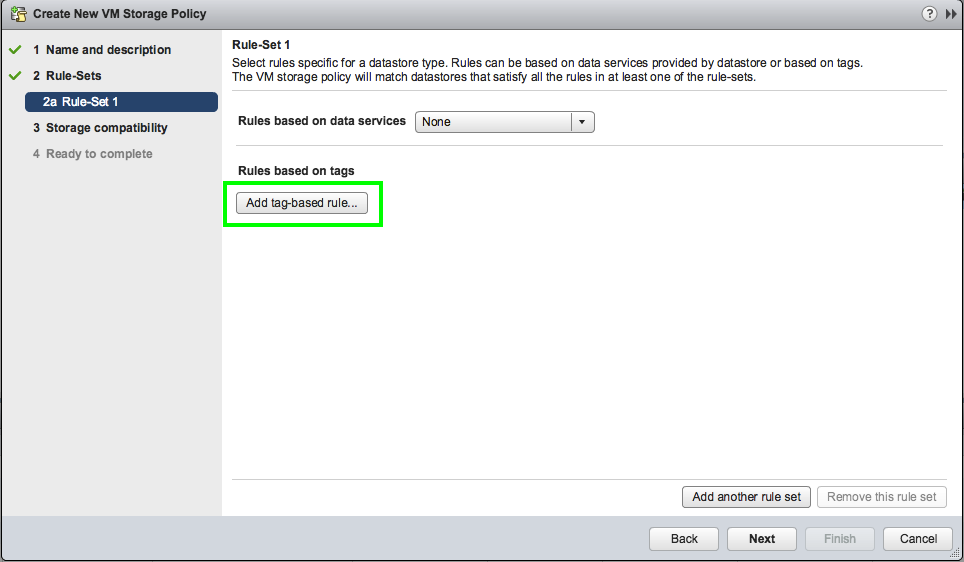 a. Provide an appropriate name for the policy. This is the name that will be used with Cinder in Platform9 VMware. Click "Next" till you reach the window labelled "Rule-Set 1". Then click on "Add tag based rule" -