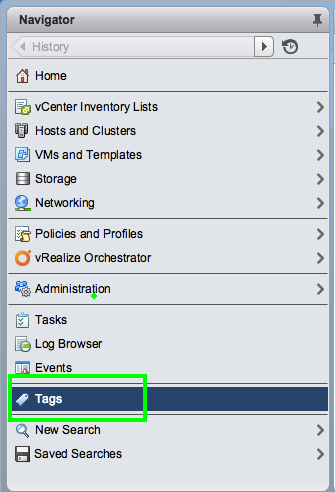 1\. Create a new tag - Create a new tag by clicking on "Tags" in vCenter Web UI under the "Navigator" tab on the left hand side.