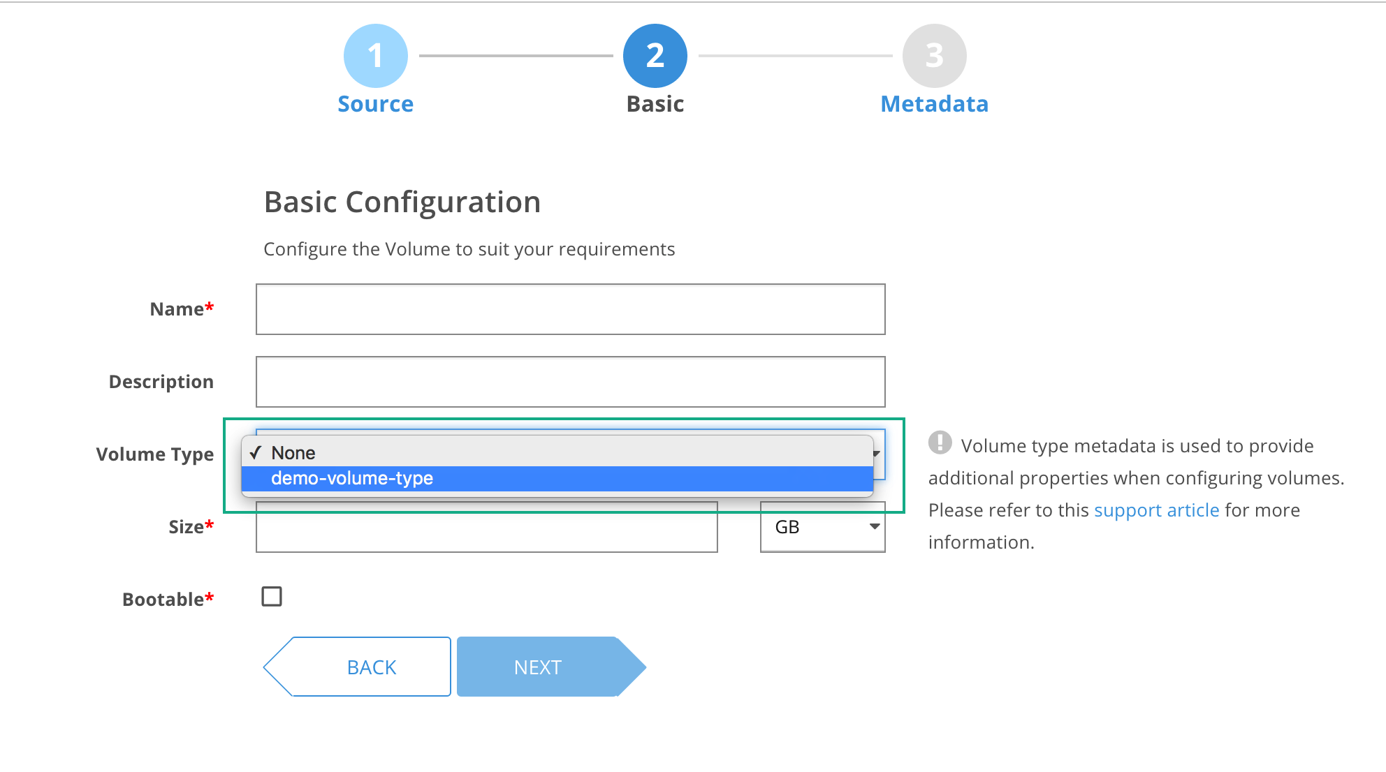 2\. Select the appropriate volume type on the "Basic Configuration" page in the volume creation wizard and the volume will be placed on one of the datastore that matches the policy corresponding to the volume type.