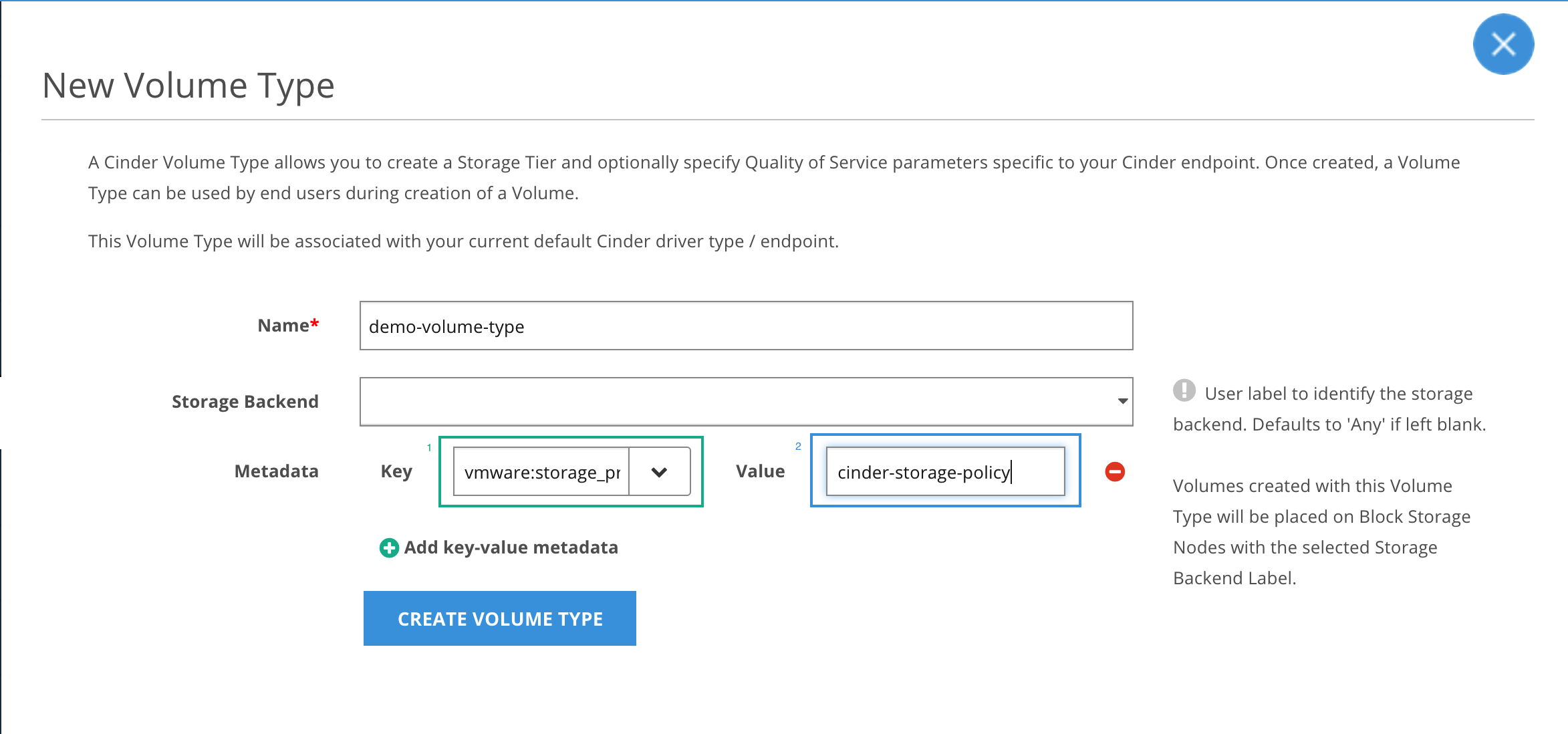 Give an appropriate name for the volume type and select "vmware:storage\_policy" from drop down for "Key" and provide the name of the policy that was configured earlier in the step (3.a) as the "Value".